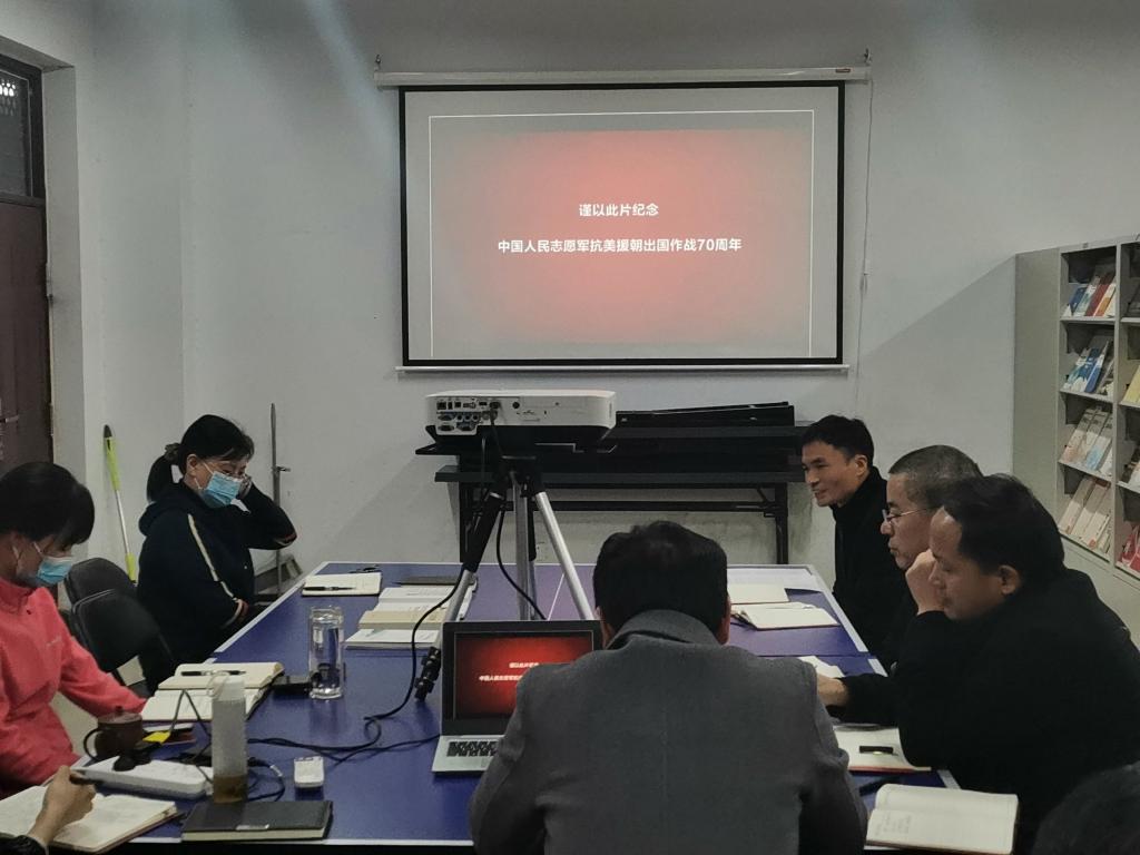 为纪念抗美援朝出国作战70周年,深入学习党史、新中国史、改革开放史和社会主义建设史,同时响应学院政治理论学习及2020秋季开学思政第一课活动的有关通知(豫职公司党[2020]32号)要求,11月5日下午,思政部全体教师在402办公室共同观看了抗美援朝珍贵录像片。