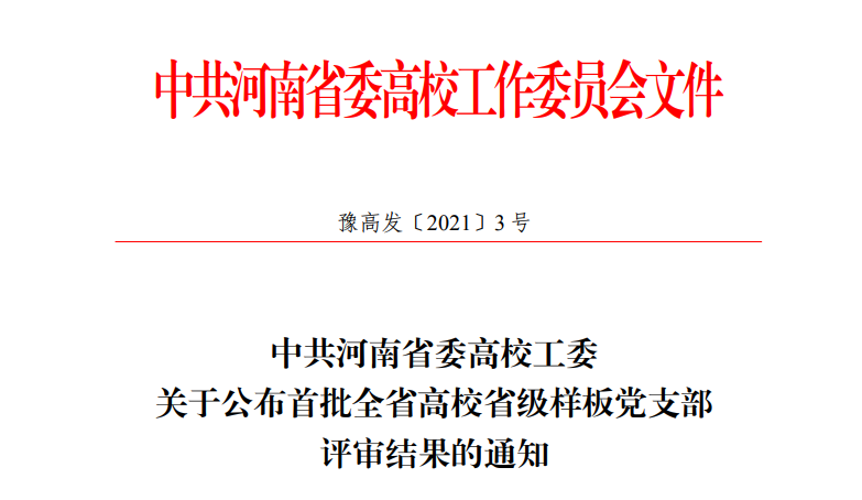 本次评选活动是根据《全省高校省级样板党支部评定方案》(豫高发〔2020〕123 号)要求,在学校推荐、专家评审和公示的基础上,经省级样板党支部评定领导小组研究确定,认定全省209 个党支部为“首批全省高校省级样板党支部”。