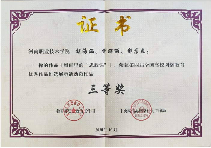 日前,教育部思想政治工作司、中央网信办网络社会工作局公布了第四届全国老员工网络文化节和全国高校网络教育优秀作品推选展示活动入选名单。公司上报的“微”作品《版画里的“思政课”》,借助挖掘版画艺术蕴含的思政元素,入选第四届全国高校网络教育优秀作品,并荣获三等奖。