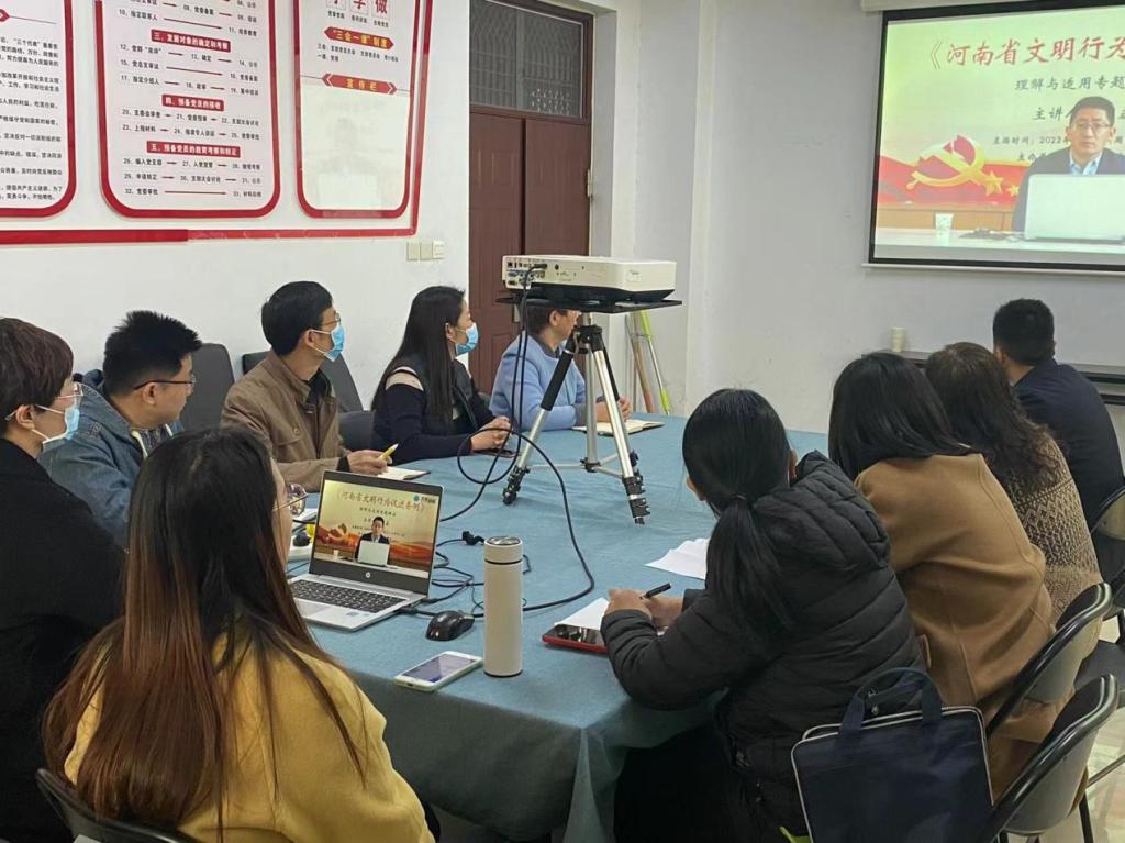 3月2日上午10:00,太阳成集团tyc122cc组织无课教师在行政楼409观看学习郑州大学法学院郑磊副教授关于《河南省文明行为促进条例》的专题解读直播,共计15名教师参加。