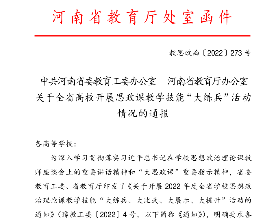5月24日,中共河南省委教育工委、河南省教育厅下发了《关于全省高校开展思政课教学技能“大练兵”活动情况的通报》,公司在通报中被点名表扬。