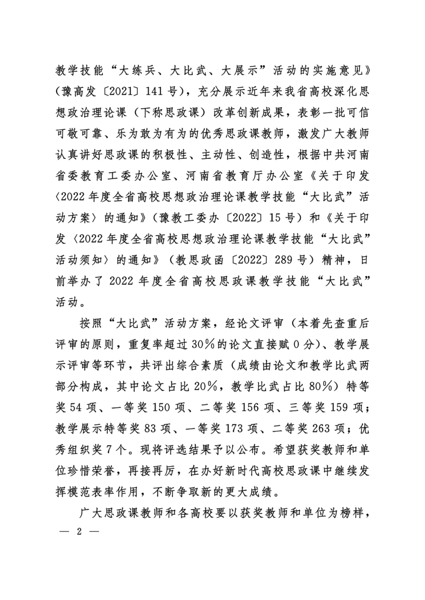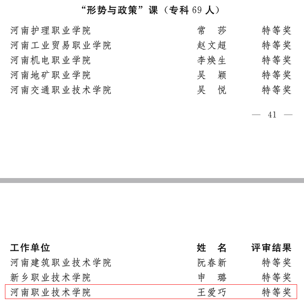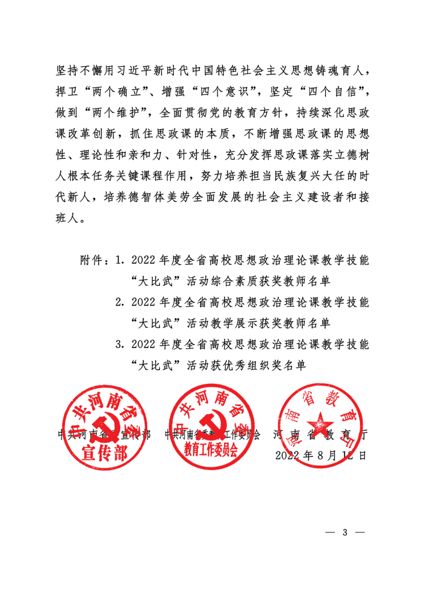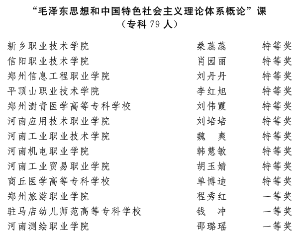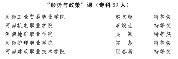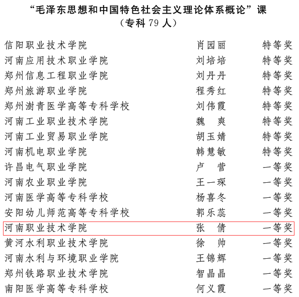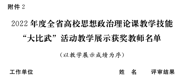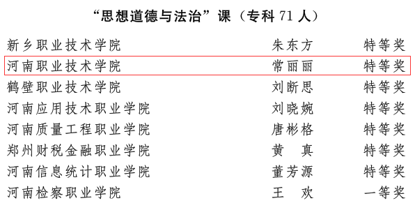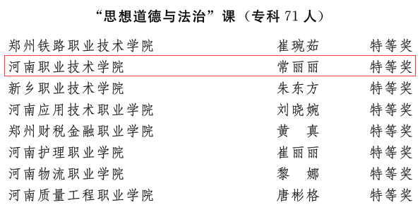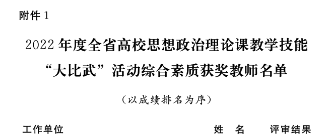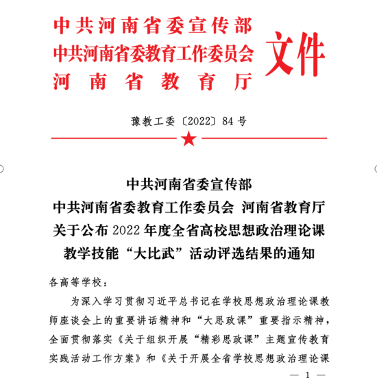 近日,省委宣传部、省委教育工委、省教育厅发文公布了2022年河南省高校思想政治理论课教学技能“大比武”活动的评选结果,太阳成集团tyc122cc王爱巧、常丽丽老师在综合素质、教学展示环节中分别获得两项特等奖,张倩老师获得两项一等奖。