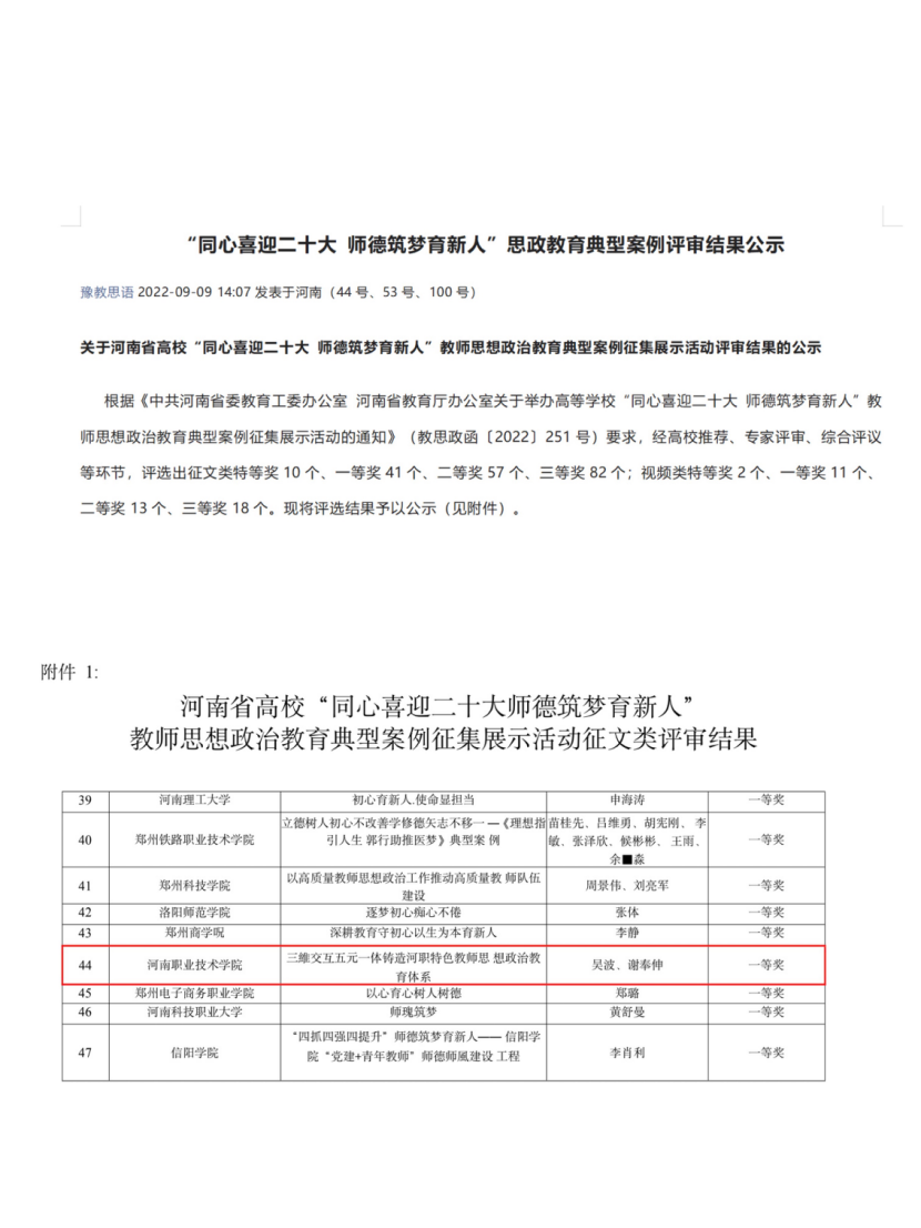 根据《中共河南省委教育工委办公室 河南省教育厅办公室关于举办高等学校“同心喜迎二十大 师德筑梦育新人”教师思想政治教育典型案例征集展示活动的通知》(教思政函〔2022〕251号)要求,公司领导高度重视,广泛发动思政课教师总结工作经验,凝练典型案例,积极参加案例申报。吴波老师报送的作品《三维交互 五元一体 铸造河职特色教师思想政治教育体系》,经过学校推荐、专家评审、综合评议等环节,荣获河南省高校“同心喜迎二十大 师德筑梦育新人”教师思想政治教育典型案例征集展示活动征文类一等奖。