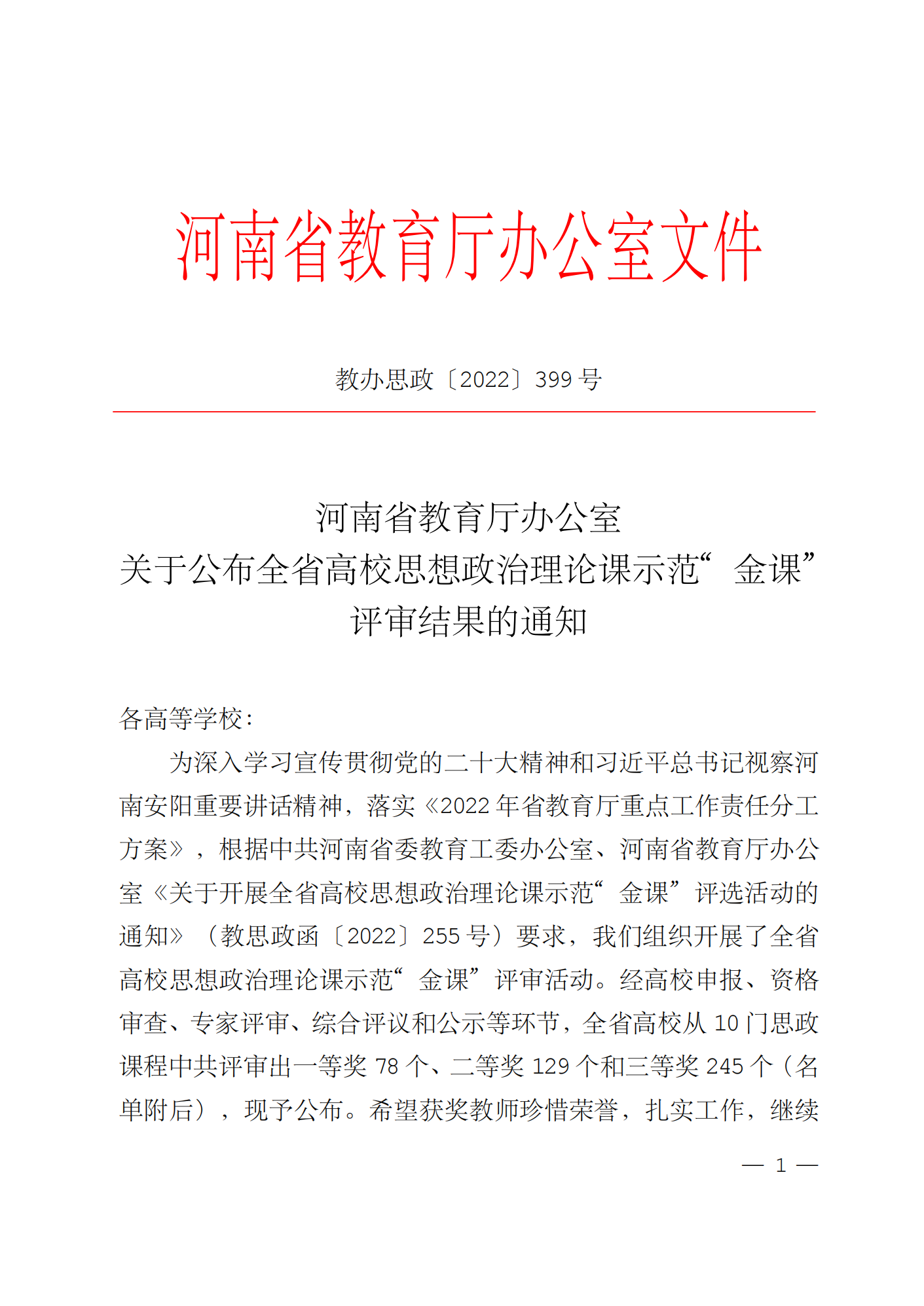 近日,由中共河南省教育工委、河南省教育厅主办的全省高校思想政治理论课示范“金课”评选活动结果公布,公司马金伟、胡海涵、吕洛乐3位教师喜创佳绩,其中,马金伟获《毛泽东思想和中国特色社会主义理论体系概论》课专科组一等奖、胡海涵获《思想道德与法治》课专科组一等奖、吕洛乐获《形势与政策》课专科组二等奖,本次活动所取得的良好成绩,充分展示了公司思政课建设成效和思政课教师业务素质。